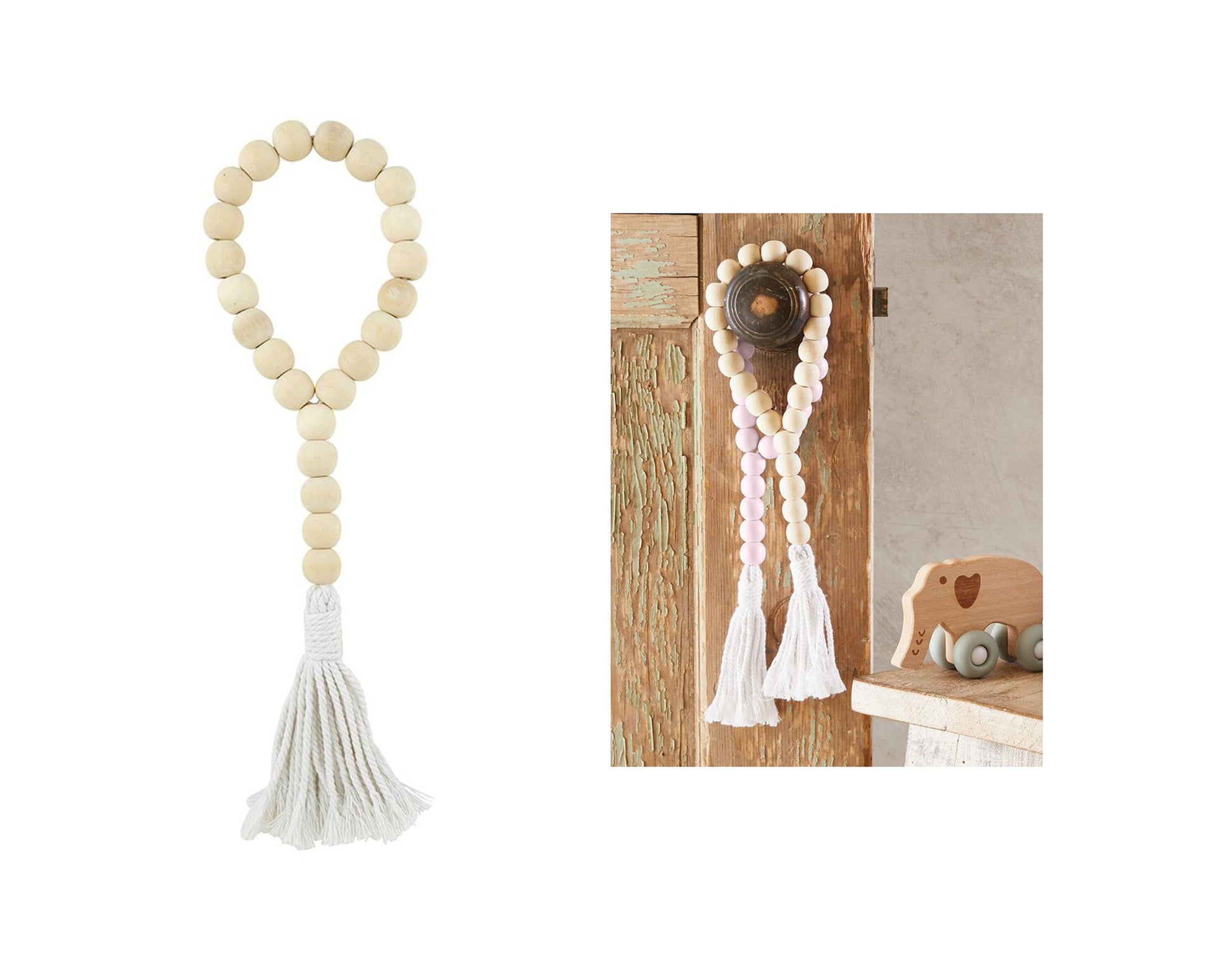 ♥ Looped Wood Garland; Maple wood garland, with soft cotton tassel, is the perfect finishing touch to baby's nursery. Material: Maple Wood; Size: 11.5" total L, 5.25" L loop.