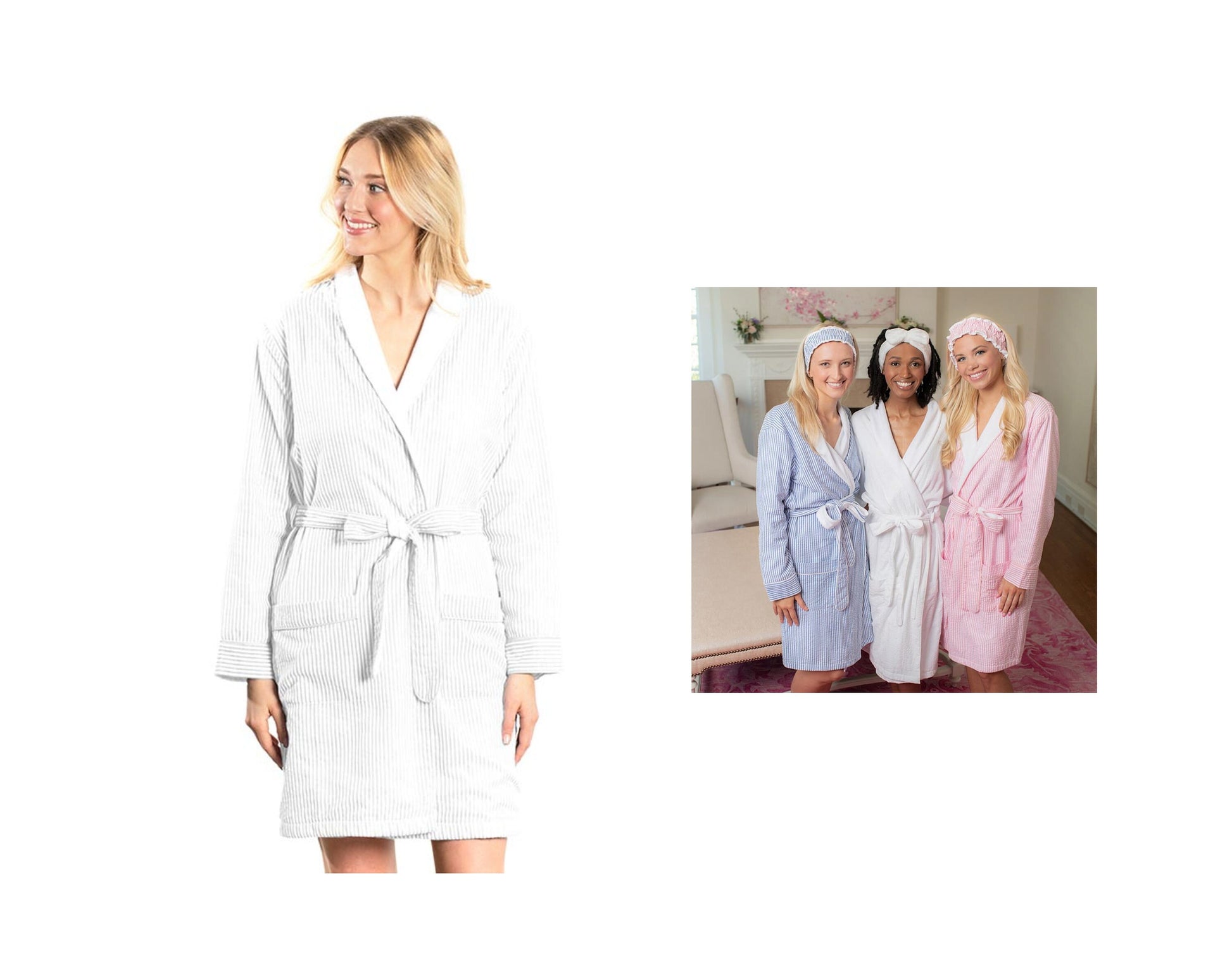 ♥ Seersucker Dream Robe With Terry Lining; The seersucker striped robes have a cozy terry lining, two front pockets and a shawl collar. Material: 100% cotton (preshrunk) Size: L/XL (US sizes 10-16): 38" length, 42"-50" chest, 50" width, 22.5" sleeves, 77" belt.