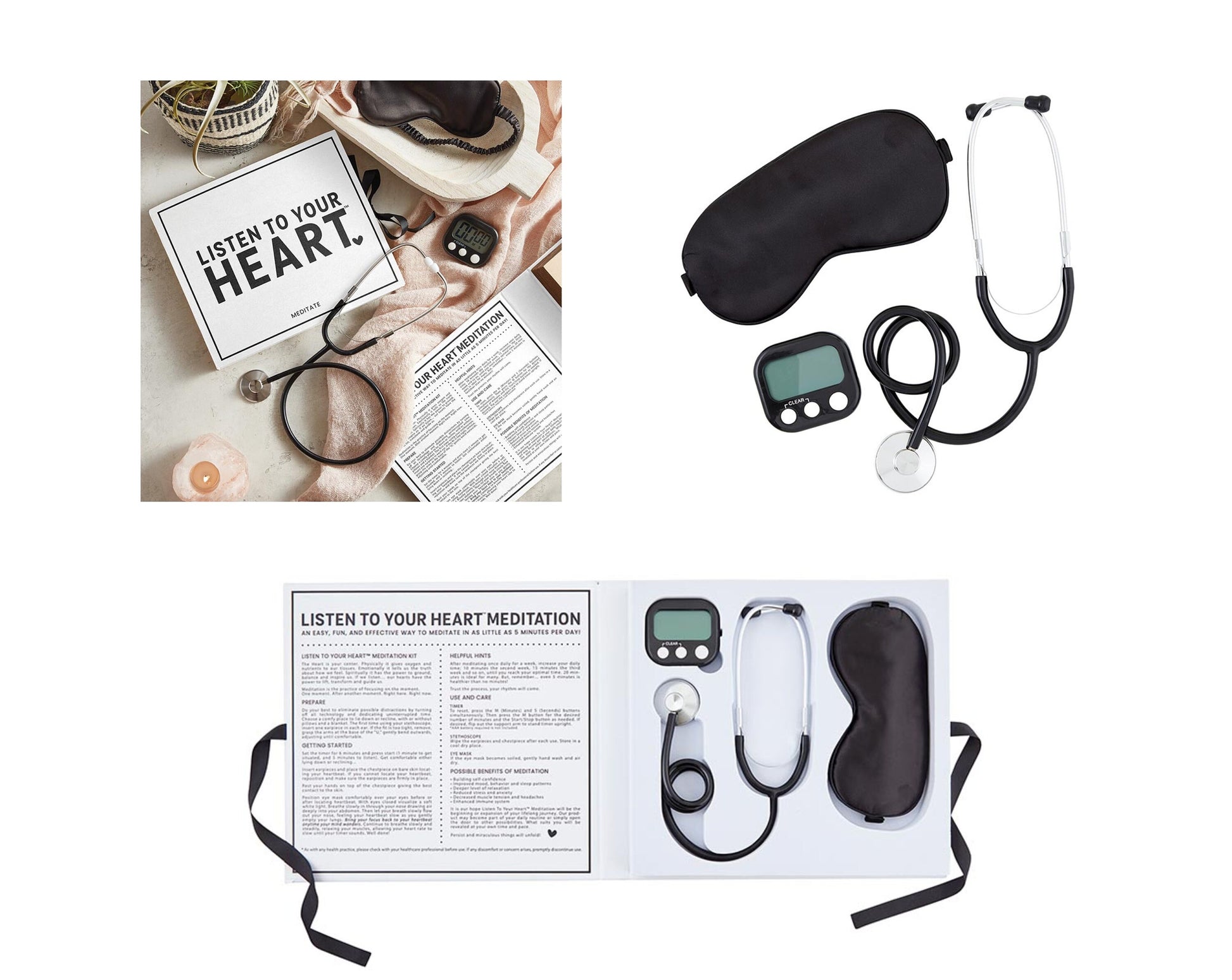 ♥ Listen to Your Heart® Meditation Kit; An easy, fun, and effective way to meditate. The kit includes a Stethoscope, Eye Mask, Timer, and Easy Start Guide – everything needed for a daily meditation practice. AAA battery not included.